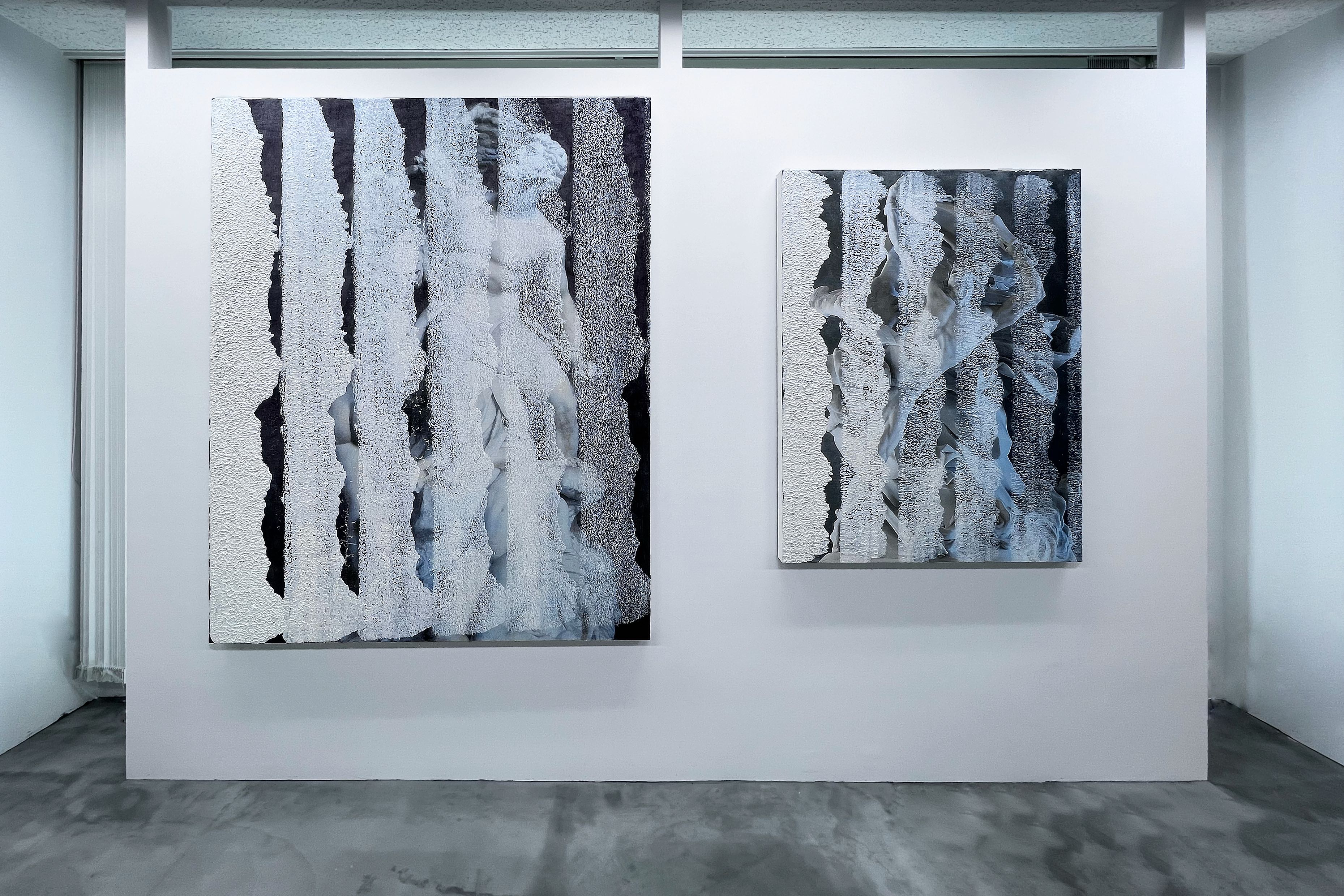 The texture which is made by decaying and repeated white painting and “Calcite” covers “Myth” and implies something with it.