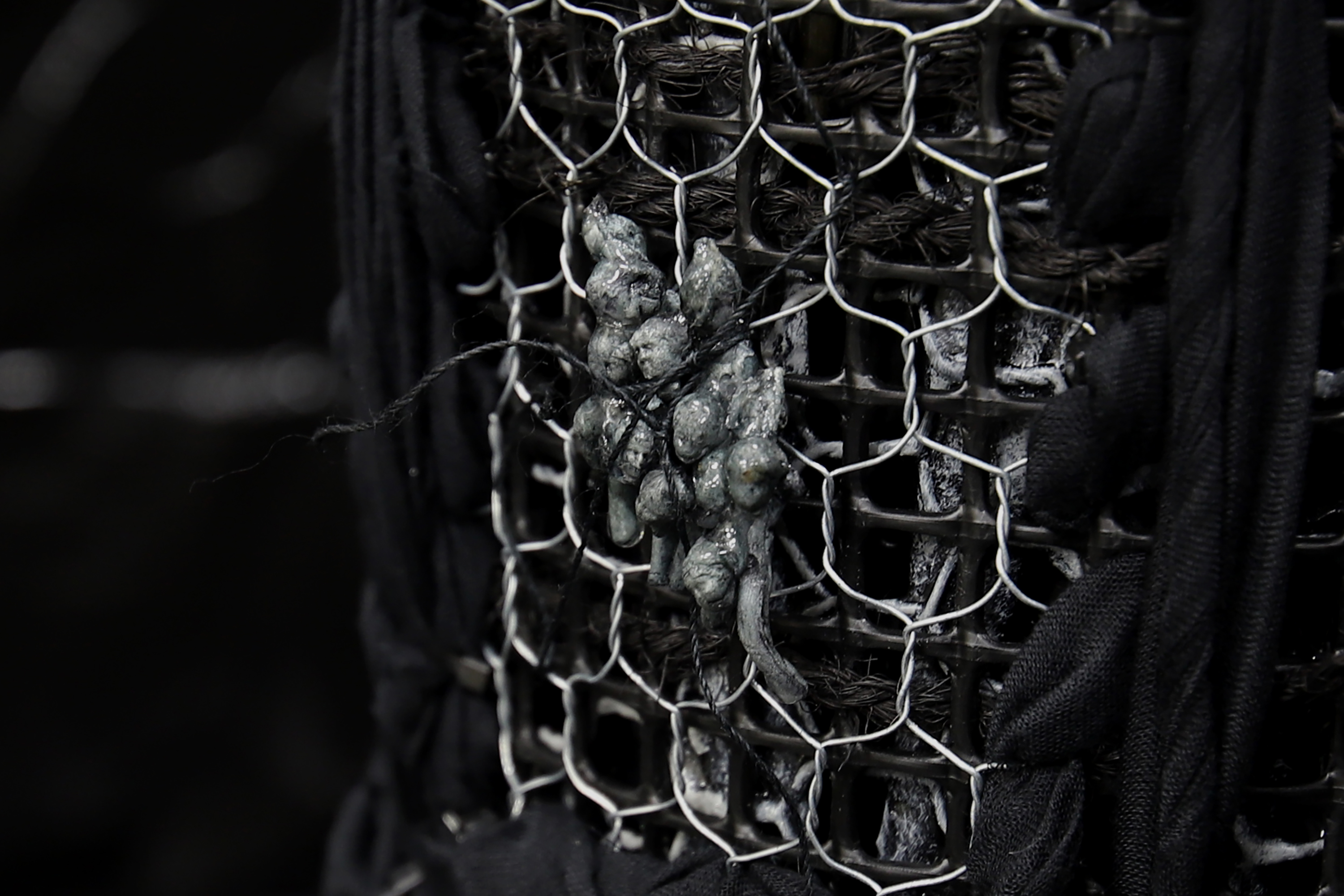 straw bundles from matsudo, steel net, plastic netting, jute ropes, fabric, cement, stone clay